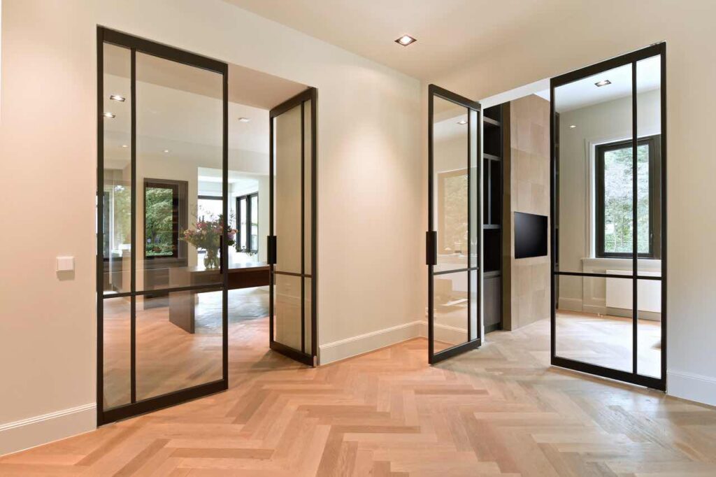 In deze woning zijn er verschillende kleuren en tinten die bij de vloer moesten passen. De tinten die in dit huis vooral naar boven komen zijn zwarte stalen accenten. De houten uitstraling en de zwarte stalen deuren en ramen zorgen dat de woning bij elkaar komt als één geheel.